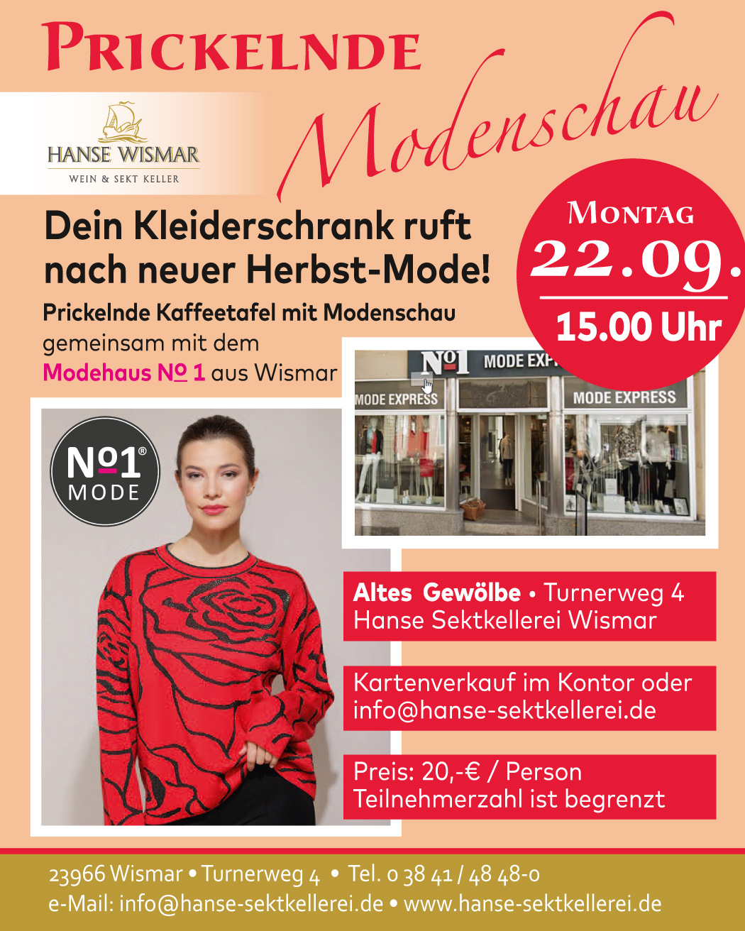 Am 22.9.2025 um 15.00 Uhr findet zu zweiten Mal im "Alten Gewölbe" der Hanse Sektkellerei eine besondere Kaffeetafel statt - eine PRICKELNDE MODENSCHAU. Gemeinsam mit dem Modehaus NO 1 veranstalten wir einen gemütlichen Nachmittag mit Kaffee, Kuchen, Sekt und der neusten Herbstmode. Frau Dörthe Wagner von Mode NO 1 präsentiert mit Ihren Models die neue Kollektion. Kommen Sie gern vorbei, bringen Sie Ihre besten Freundinnen mit und lassen Sie sich inspirieren.